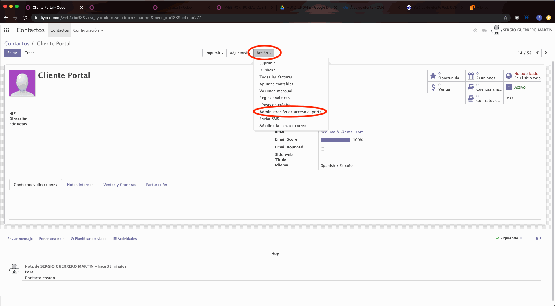 Haga click en menú Acción y en el menú desplegable haga click en la opción Administración de acceso al Portal.