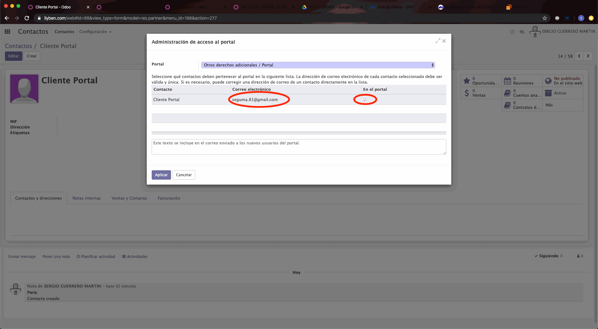 En la ventana emergente seleccione la casilla En el Portal. Asegurase que el campo Correo electrónico se encuentra relleno con el email correcto. Tambien puede agregar contenido al email que se enviará, rellenando la casilla de texto en el pie de la ventana emergente. Por último haga click en Aplicar cuando haya terminado.