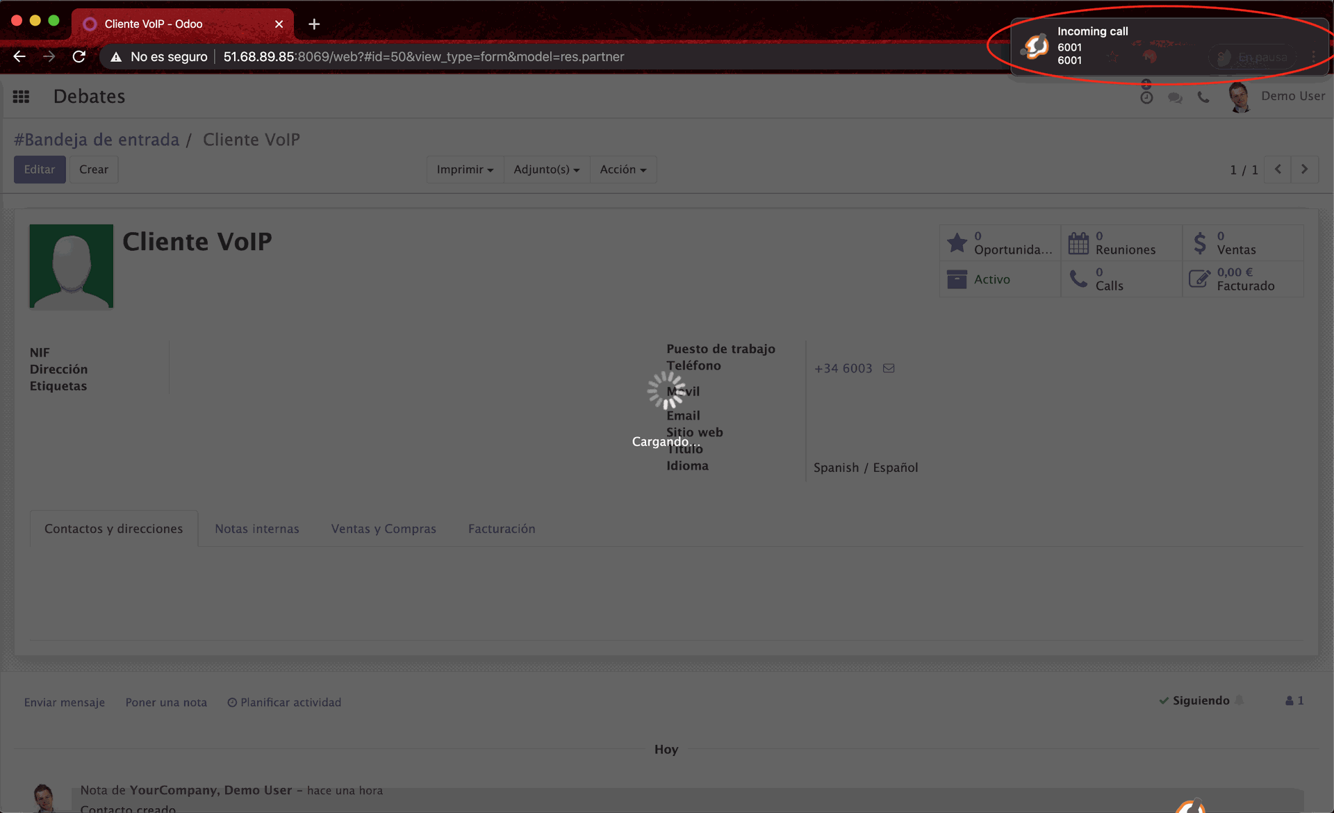 Busca el número de teléfono de la llamada entrante en los clientes de Odoo. Si un registro coincide, lo lleva a la vista de formulario de este registro. Si no hay coincidencias de registros, se abre un asistente que propone crear un nuevo socio con el número de teléfono o actualizar un cliente existente.