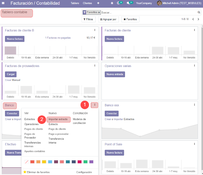1. Una vez tenga su archivo en formato N43 de su bando, ir a Contabilidad (Facturación) > Tablero, y escoja “Importar extracto” en el cuadro que corresponda con el diario de su banco.
