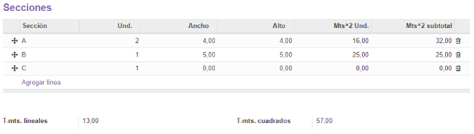 En este nuevo grupo se puede ir añadiendo las distintas con sus medidas, calculando tanto los metros lineales y cuadrados de cada sección como los totales de todas las secciones.